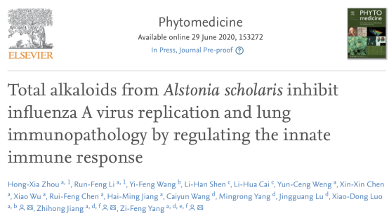 近日,广州呼吸健康研究院、呼吸疾病国家重点实验室杨子峰研究员团队联合中国科学院昆明植物研究所植物化学与西部植物资源持续利用国家重点实验室罗晓东研究员,以及澳门科技大学中药质量研究国家重点实验室姜志宏教授,对傣族名药灯台叶的总生物碱(total alkaloids from Alstonia scholaris,TA)开展了抗流感病毒活性与机制的体内外研究。该成果形成论文 “Total alkaloids from Alstonia scholaris inhibit influenza A virus replication and lung immunopathology by regulating the innate immune response”被医学一区(2020年中科院SCI期刊分区)杂志《Phytomedicine》收录。广州医科大学周红霞博士和广州呼研院李润峰助理研究员为共同第一作者,杨子峰研究员、罗晓东研究员和姜志宏教授为共同通讯作者。